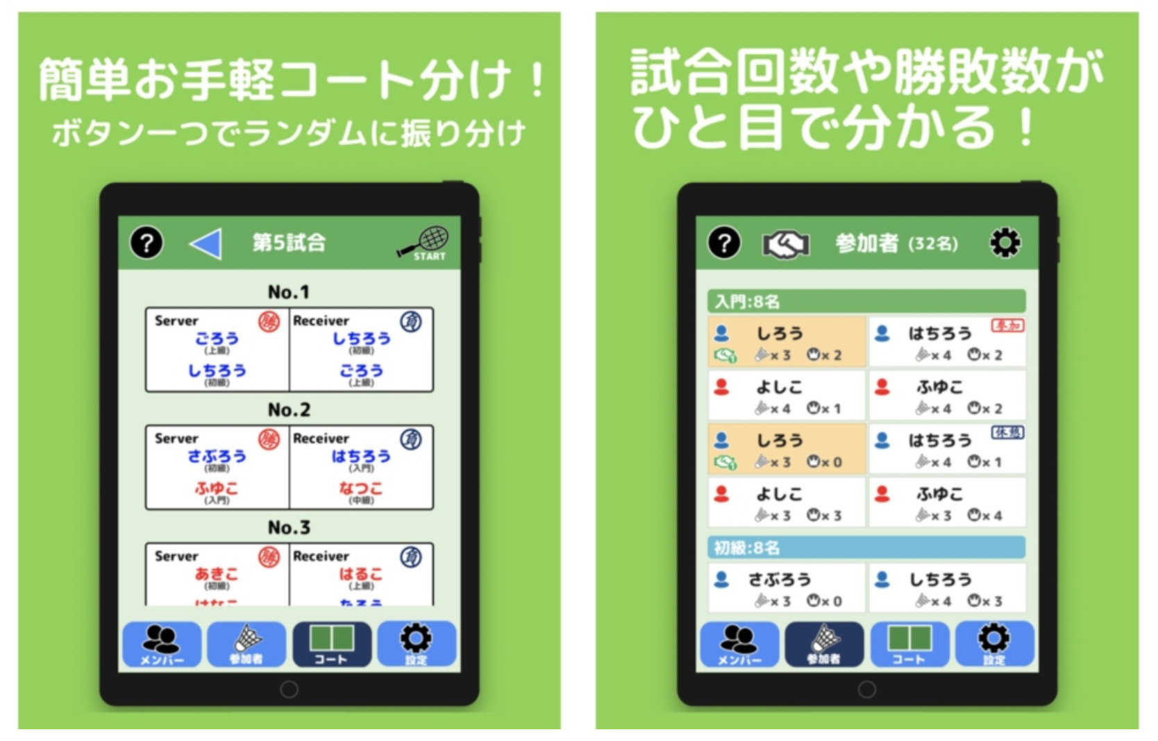『競技ペア決めコート振り分けアプリ』はバドミントンを意識したUIで、多くのサークルで利用されています。